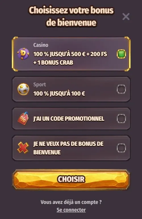 - Choisissez votre bonus de bienvenue : Profitez de l’offre de lancement exclusive : 100 % jusqu’à 500 € + 200 free spins + 1 Bonus Crab.